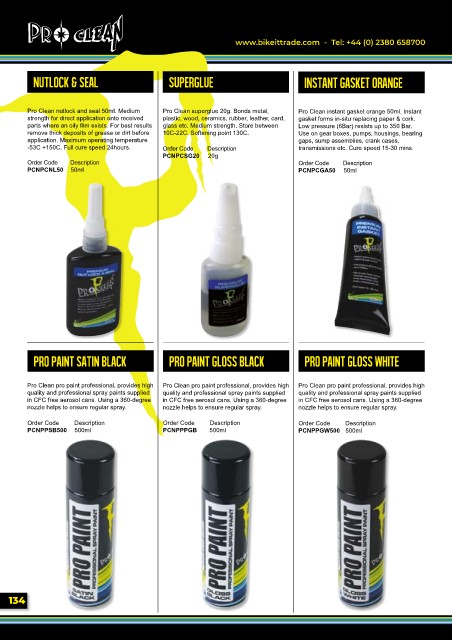 Pro Clean nutlock and seal 50ml. Medium Pro Clean superglue 20g. Bonds metal, Pro Clean instant gasket orange 50ml. Instant