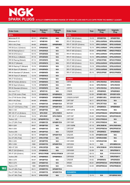 RR 50 Racing (Motard) 07-12 SPKBR9ES N/A RR 4T 450 (Enduro) 05-09 SPKDCPR8E SPKDCPR8EIX